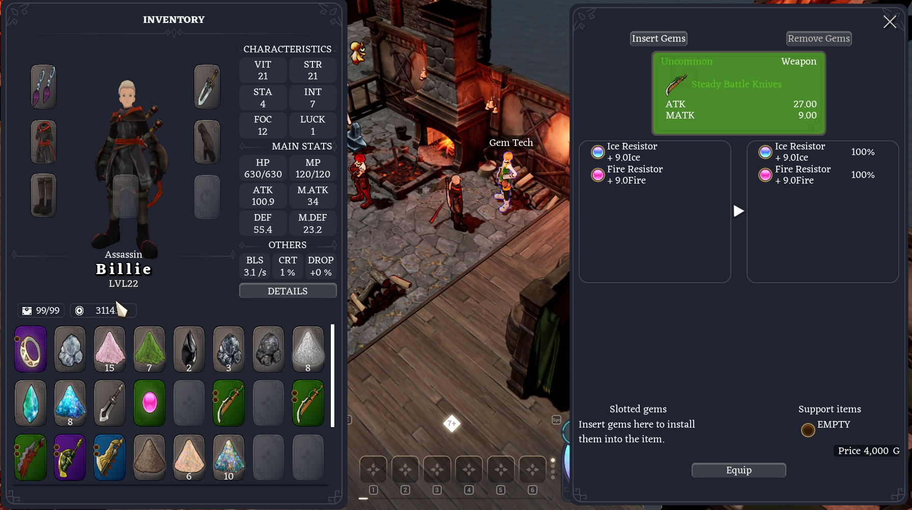 During missions, you'll notice monsters dropping unique "gems." Don't ignore them! Take these gems to the Gem Tech NPC in the town area. By adding these gems to your weapons and gear, you'll get handy bonuses, like extra strength in your attacks or added elemental power. Make sure to use those gems — they're your ticket to better equipment!